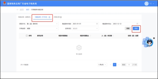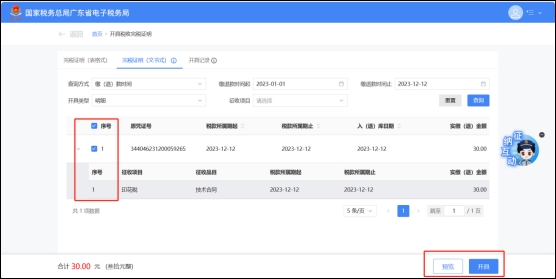 点击【查询】,显示可开具完税证明的凭证信息,勾选需要开具完税证明的凭证信息。纳税人可以选择直接开具或预览后开具。