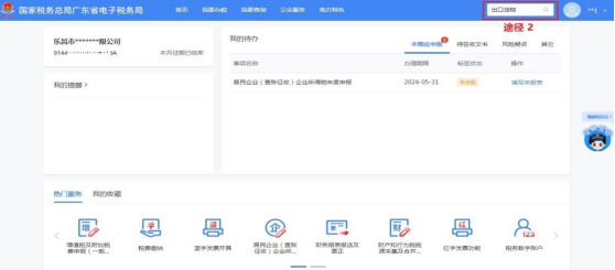 纳税人登录新电局后,按下方图示的“途径1”在首页点击【我要办税】→【证明开具】→【出口货物已补税/未退税证明】。也可以按“途径2”在首页右上方搜索栏输入“出口货物……”关键字,即可快速选择进入【出口货物已补税/未退税证明】操作页面。