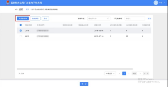 1.点击“数据获取”,输入“核销数据年度”,点击“确认”按钮,可在列表中查看加贸数据获取情况。
