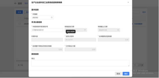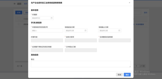 1.在采集列表页面点击“新增”按钮,弹出“生产企业进料加工业务免抵退税核销表”页面,可新增手账册信息。