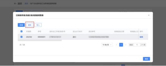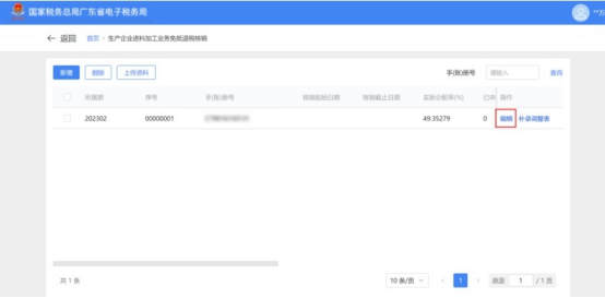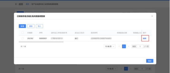 2.点击“编辑”按钮,弹出“生产企业进料加工业务免抵退税核销表”页面,可修改获取的手账册信息。