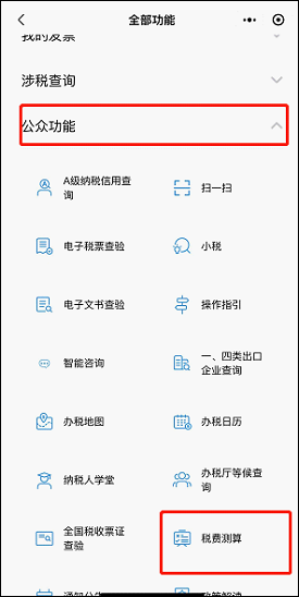 2.点击【公众功能】--【税费测算】