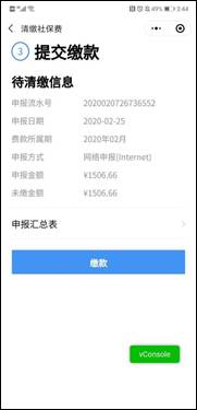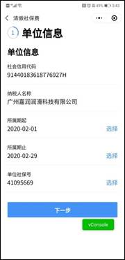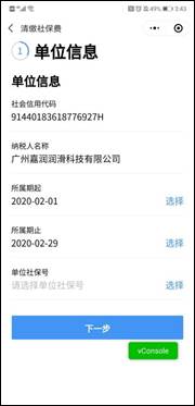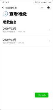 4.点击【社保缴费】功能进入单位信息页面,选择对应的单位社保号码,点击【下一步】进入查看待缴页面: