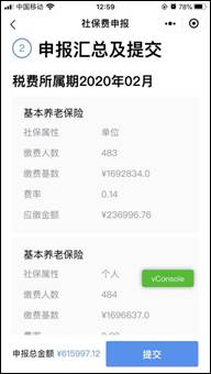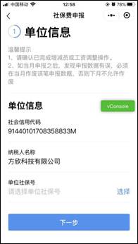 3.点击【社保申报】功能进入单位信息业务,选择对应的社会信息,点击【下一步】进入申报汇总信息页面: