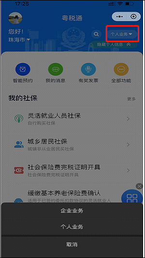 2.人脸识别认证登陆后,首页右上角下拉三角标识,自行根据需要选择企业业务或个人业务。