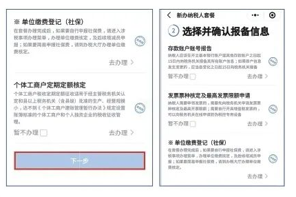 5.选择并确认报备信息,其中存款账户报告、发票票种核定、个体户定期定额为选填项目,填写缴费登记(社保)是必填项目,填写完毕后点击【下一步】填写银行账号信息