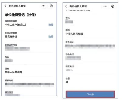 8.单位缴费登记(社保)是必填项目,选择缴费单位类型(一般以有雇工为主),填写个人信息,核对无误点击【下一步】
