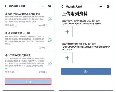 10.报备信息填写完毕后直接点击【下一步】,跳转界面后显示上传附列资料,纳税人可根据实际情况选择上传,阅读提示内容后选择“否”或“是”,新办纳税人套餐流程填写完毕。请耐心等待税务部门审核,审核成功将发送短信通知。