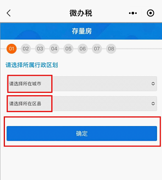 4.进入页面后,选择房产所在地“城市”、“区县”,然后点击【确定】。