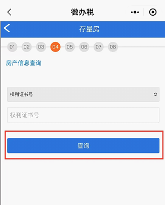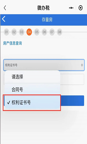 7.进入“房产信息查询”页面,点击下拉按钮,选择权利证书号,并在输入框中输入对应的权利证书号,然后点击【查询】进行房源信息查询。