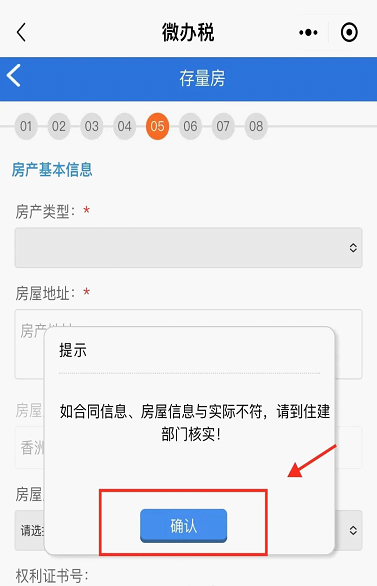 9.进入房产基本信息填写界面后,系统会弹出“如合同信息、房屋信息与实际不符,请到住建部门核实!”,如下图示,点击【确认】即可。