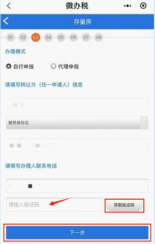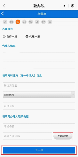 (2)若选择代理申报,代理人信息栏系统自动显示当前绑定个人账号的姓名和证件号码,纳税人需核对代理人信息是否正确。然后填写转让方(任一申请人)信息及手机号码,点击【获取验证码】,待收到后填写验证码,然后点击【下一步】。