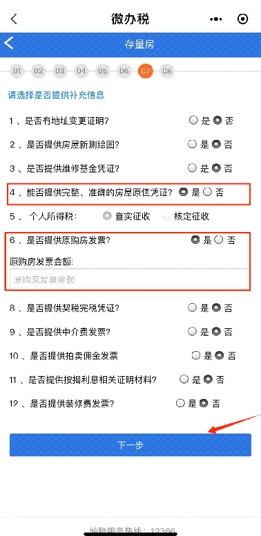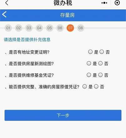 11.进入选择是否提供补充信息页面,如下图所示。纳税人根据页面的提示,选择是否补充相关信息,然后点击【下一步】。