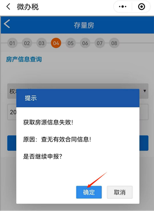 8.点击【查询】后会弹出提示“获取房源信息失败,原因:XXX!是否继续申报”,如下图所示,点击【确定】则可进入到下一步。