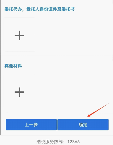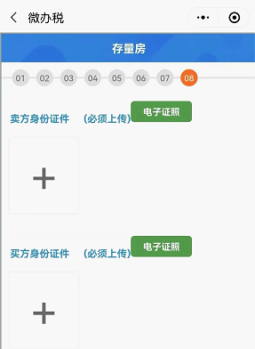 12.进入上传资料页面,如下图所示。系统根据纳税人填写的买(卖)方信息、补充信息等显示纳税人需要上传哪些资料文件;点击“+”进行拍照或上传文件进行上传。上传成功后点击【确定】。