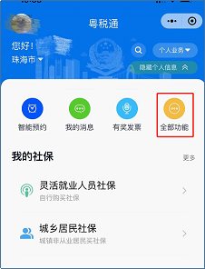 1. 微信搜索“粤税通”,登陆粤税通进入首页,点击【全部功能】。