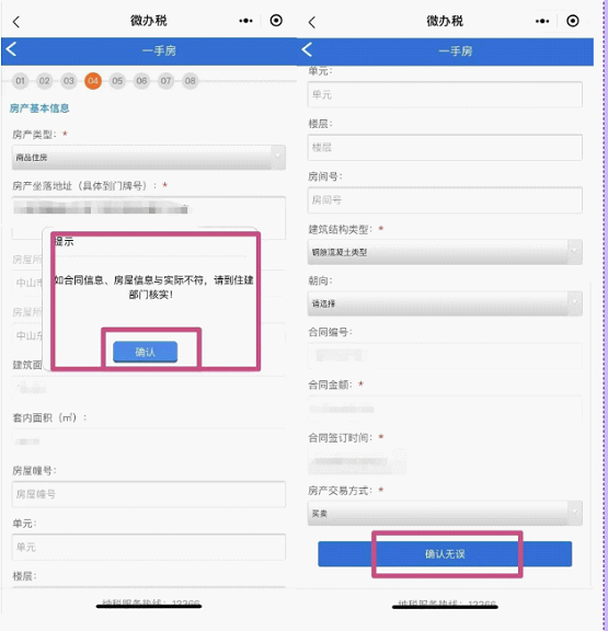 9.获取、补充房产基本信息,如合同信息、房屋信息与实际不符,建议纳税人到房产所在的住建部门核实。无误则点击“确认无误”。