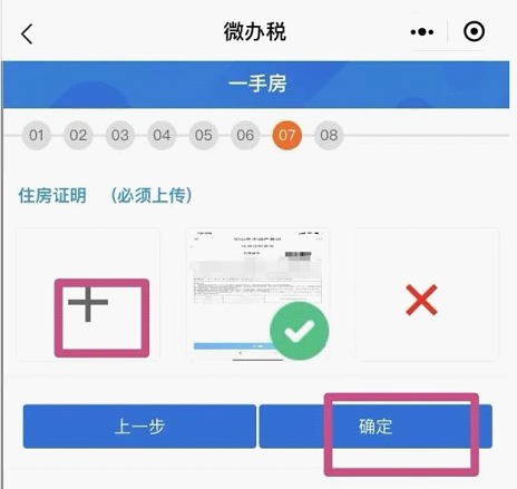 12.上传资料,需要享受契税减免优惠的,要提供减免契税证明材料,点击“确定”。(住房证明可到当地不动产登记部门打印)。