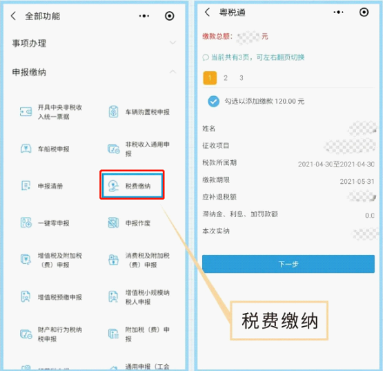 2.点击【申报缴纳】选择“税费缴纳”,核对缴费总额和缴款信息,无误后点击【下一步】