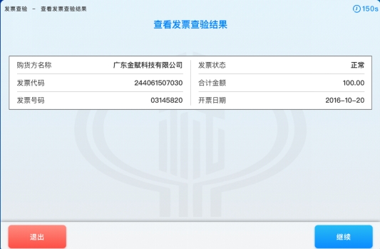3. 进入“发票查验结果”界面,纳税人查看发票查验结果。点击【退出】按钮,则完成发票的查验业务办理,如下图所示: