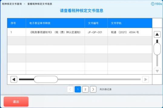 4. 进入“查看税种核定文书信息”界面,查看查询结果。点击【退出】按钮,则完成纳税信用评价查询业务办理,如下图所示: