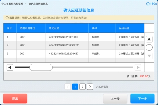 5. 显示所选年份的应征明细信息,纳税人确认应征明细信息,点击【下一步】按钮,如下图所示: