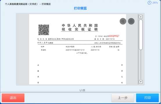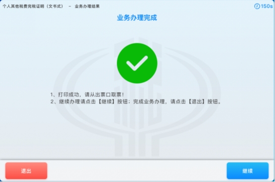 7. 打印税收电子完税证明成功后,系统弹出框提示是否继续办理业务,若需要继续办理,则点击【继续】按钮,系统跳转到功能主界面;若不需要继续办理,则点击【退出】按钮,系统返回到系统主界面,如下图所示: