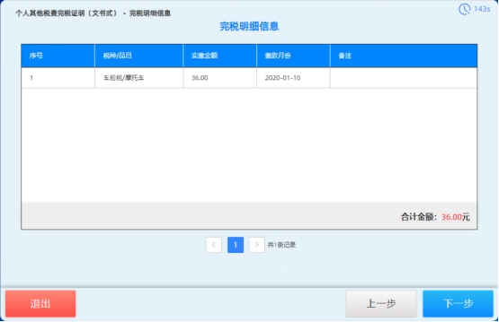 4. 进入“完税明细信息”界面,纳税人确认完税明细信息,点击【下一步】按钮,如下图所示: