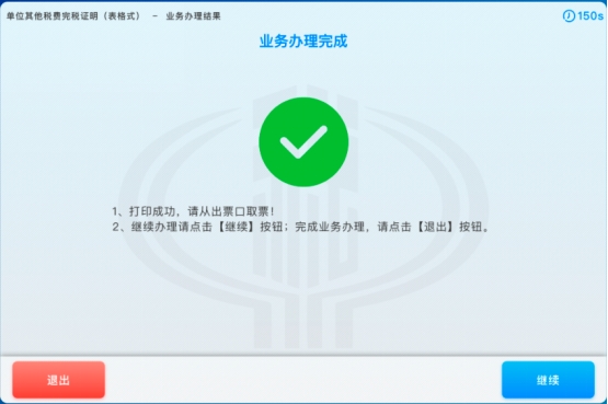 7. 打印成功后,进入“业务办理完成”界面。纳税人若需要继续办理,则点击【继续】按钮,系统将返回到功能主界面;若不需要继续办理,则点击【退出】按钮,系统将返回到系统主界面。如下图所示: