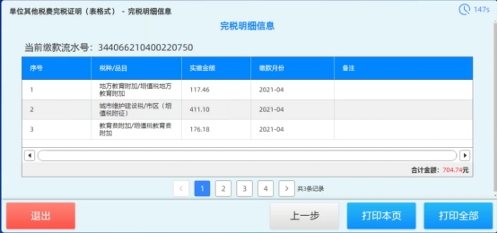 4. 进入“完税明细信息”界面,纳税人确认完税明细信息,点击【打印本页】或【打印全部】按钮,如下图所示:
