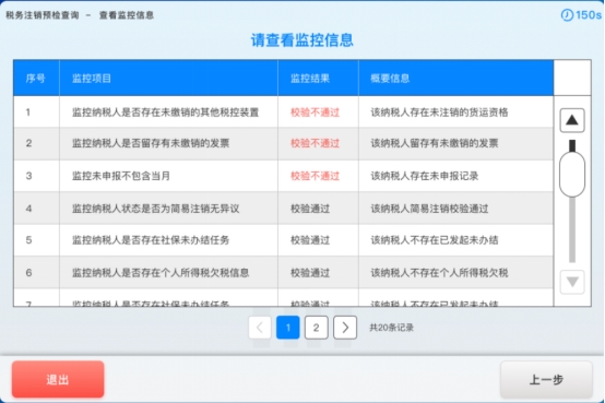 3. 进入“查看监控信息”界面,纳税人查看税务注销预检查询结果。点击【上一步】按钮,则返回上一个页面;点击【退出】按钮,则完成税务注销预检查询业务办理,如下图所示: