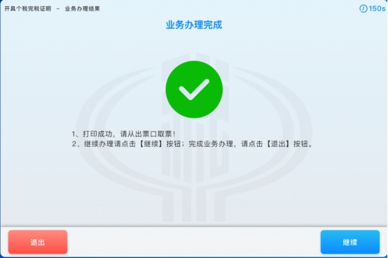 7. 打印成功后,进入“业务办理完成”界面。纳税人若需要继续办理,则点击【继续】按钮,系统将返回到功能主界面;若不需要继续办理,则点击【退出】按钮,系统将返回到系统主界面。如下图所示: