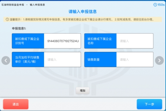 3. 进入“申报信息”输入界面,纳税人输入申报信息,点击【下一步】按钮,如下图所示: