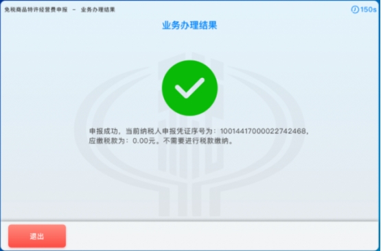 6. 若为免税申报,则无需进行缴费。申报成功后,进入“业务办理完成”界面。纳税人点击【退出】按钮,返回自助终端机系统主界面,如下图所示: