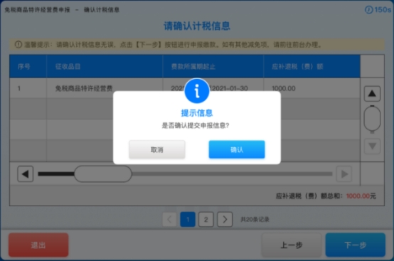 5. 系统弹出提交申报信息确认提示框,纳税人点击【确认】按钮则提交申报,点击【取消】按钮则取消申报。如下图所示: