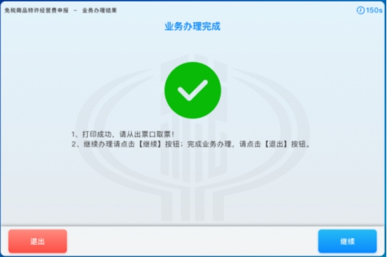 10. 打印成功后,系统进入“业务办理完成”界面,纳税人若需要继续办理,则点击【继续】按钮;若不需要继续办理,则点击【退出】按钮,返回自助终端机系统主界面,如下图所示:
