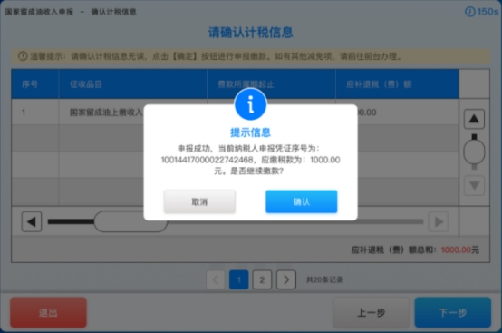 7. 若需进行缴款,系统弹出缴款确认提示框,纳税人点击【确认】按钮,进入缴款流程,如下图所示: