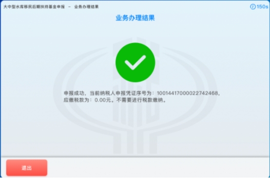 6. 若为免税申报,则无需进行缴费。申报成功后,进入“业务办理完成”界面。纳税人点击【退出】按钮,返回自助终端机系统主界面,如下图所示: