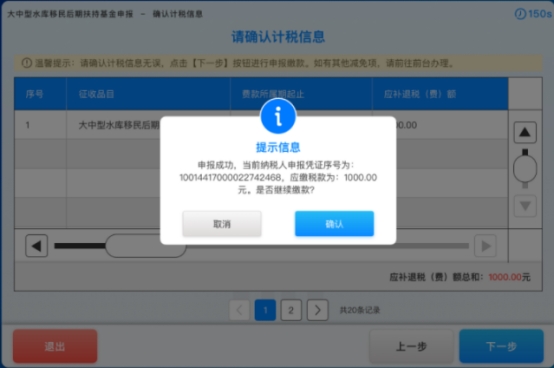 7. 若需进行缴款,系统弹出缴款确认提示框,纳税人点击【确认】按钮,进入缴款流程,如下图所示: