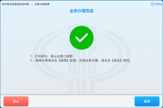 10. 打印成功后,系统进入“业务办理完成”界面,纳税人若需要继续办理,则点击【继续】按钮;若不需要继续办理,则点击【退出】按钮,返回自助终端机系统主界面,如下图所示: