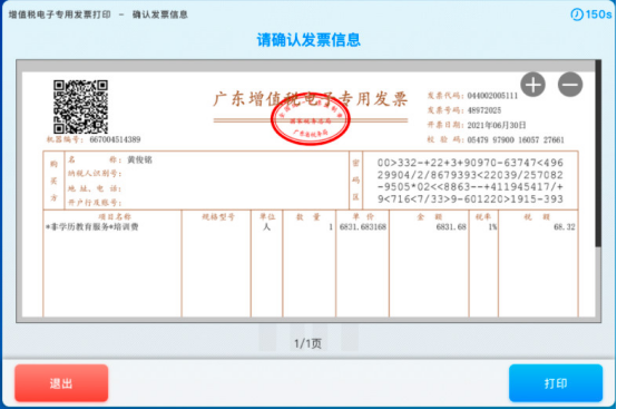 3. 进入“发票信息”确认界面,纳税人确认发票信息无误,点击【打印】按钮进行发票打印,如下图所示: