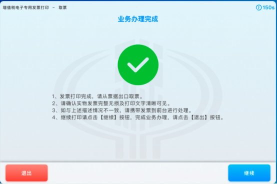 5. 打印成功后,进入“业务办理完成”界面。纳税人若需要继续办理,则点击【继续】按钮,系统将返回到功能主界面;若不需要继续办理,则点击【退出】按钮,系统将返回到系统主界面。如下图所示: