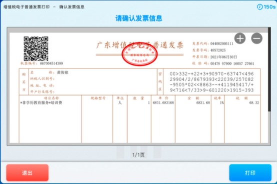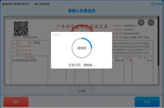 3. 进入“发票信息”确认界面,纳税人确认发票信息无误,点击【打印】按钮进行发票打印,如下图所示: