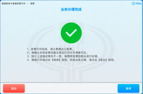 5. 打印成功后,进入“业务办理完成”界面。纳税人若需要继续办理,则点击【继续】按钮,系统将返回到功能主界面;若不需要继续办理,则点击【退出】按钮,系统将返回到系统主界面。如下图所示: