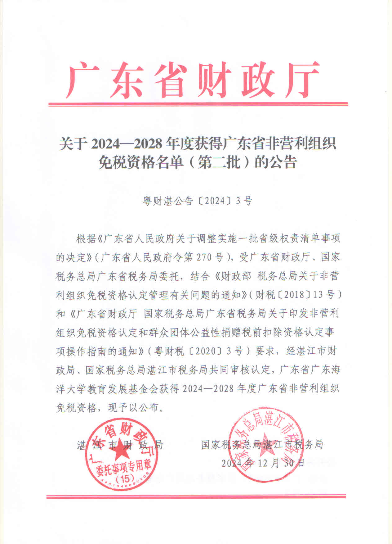 关于2024—2028年度获得广东省非营利组织免税资格名单(第二批)的公告