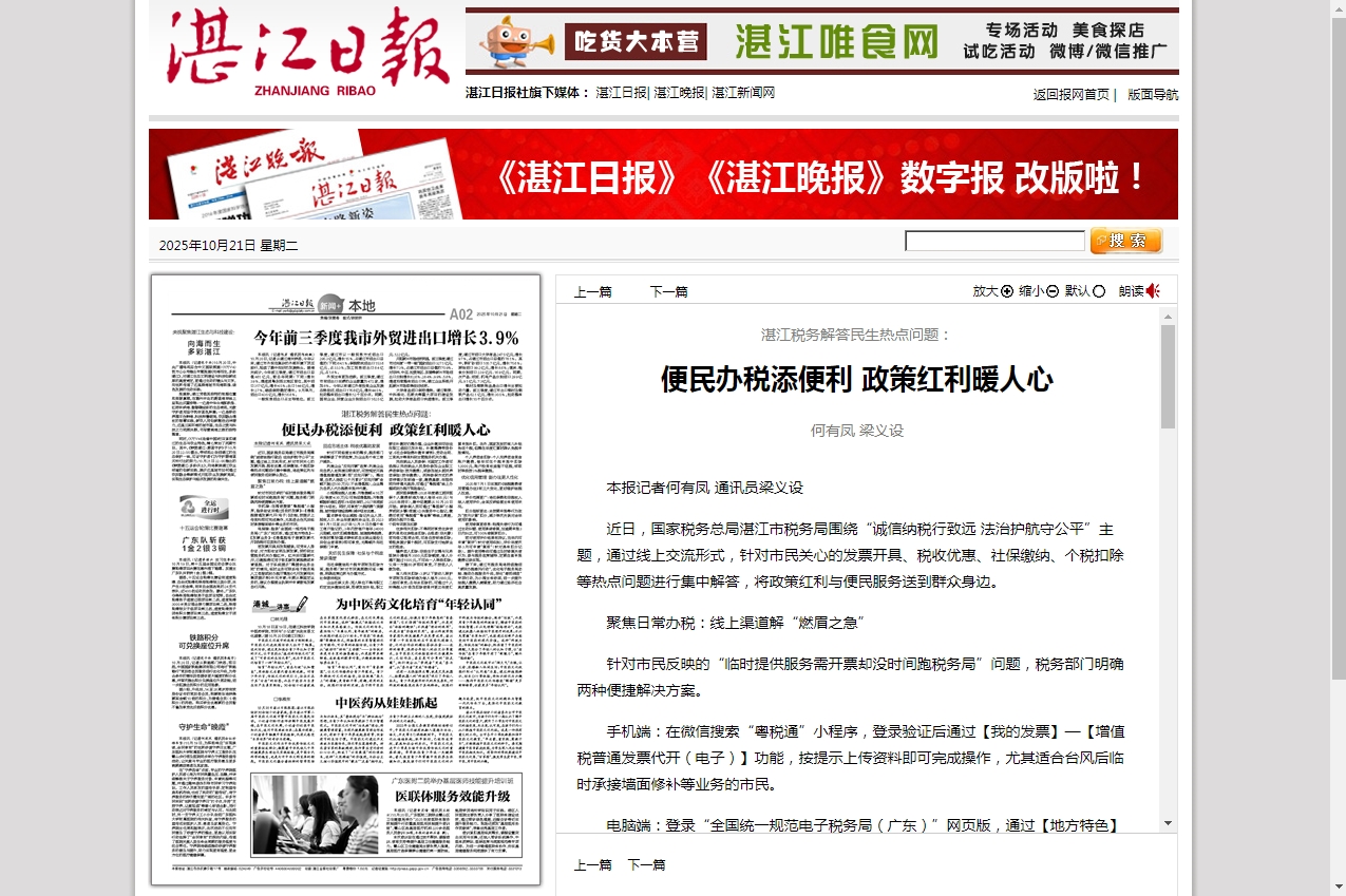 接下来,湛江市税务局将持续推进“便民办税春风行动”,优化电子税务局功能、推动办税服务升级,深化“春雨润苗”专项行动,为小微主体纾困,进一步提升纳税人缴费人满意度,助力湛江经济社会高质量发展。