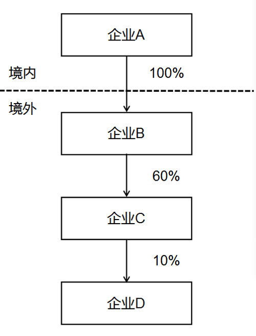 一是在一个纳税年度中的任何一天,被居民企业直接或间接持有股份或有表决权股份达到10%(含)以上的外国企业。居民企业持股比例计算方式按照本公告第二条第二款规定计算,即多层间接持有股份按各层持股比例相乘计算,中间层持有股份超过50%的,按100%计算。示例3投资架构如下,在判断居民企业股东是否达到股份控制标准时,按各层持股比例相乘计算。因外国企业B持有外国企业C的股份比例超过50%应按100%计算,故居民企业A间接持有外国企业D的股份比例为10%,计算公式为100%×100%×10%=10%,符合本公告规定条件。居民企业A应就外国企业B、C和D分别填报《报告表》。