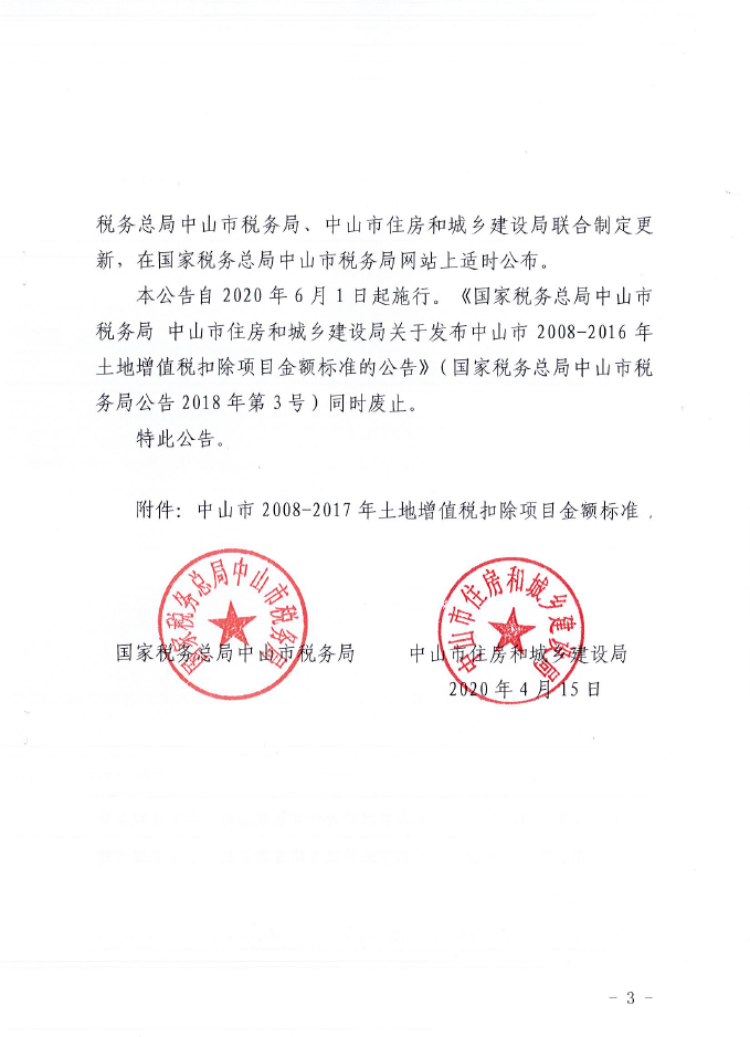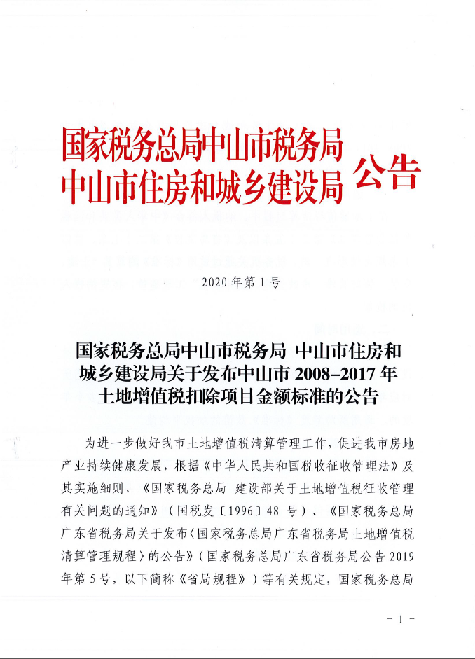国家税务总局中山市税务局 中山市住房和城乡建设局关于发布中山市2008-2017年土地增值税扣除项目金额标准的公告