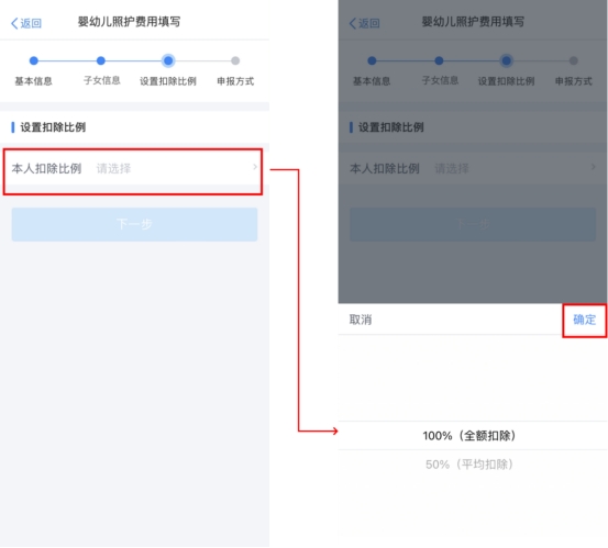 第四步,设置扣除比例。完成子女信息填写后,纳税人根据实际情况在“本人扣除比例”中选择100%(全额扣除)或50%(平均扣除)其中一种。选择完成并确定后,点击“下一步”。