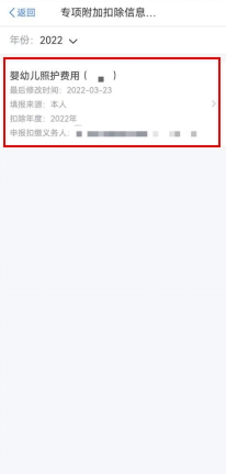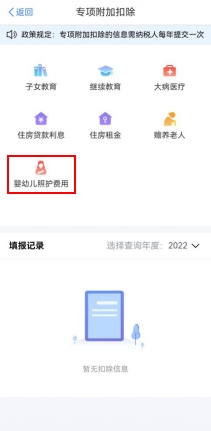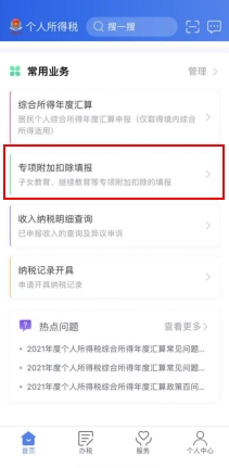第一步,进入申报界面。纳税人登录手机个人所得税APP后,可通过“首页——常用业务——专项附加扣除填报”或“办税——专项附加扣除填报”进入专项附加扣除填报界面,并选择“婴幼儿照护费用”专项附加扣除。
